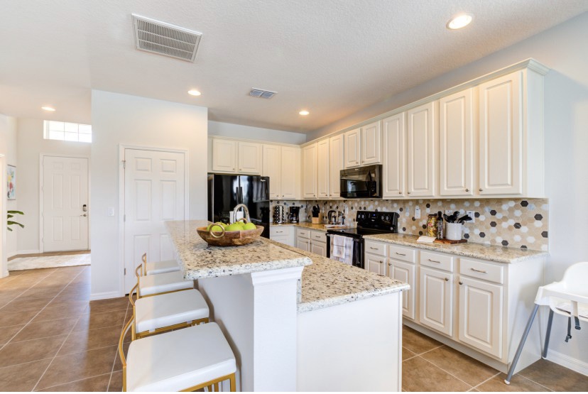 Inside you’ll find a fully equipped kitchen, fast Wi-Fi and themed arcade games. Every bedroom has cozy linens and smart TVs. Outside, relax in the screened pool with resort landscaping.